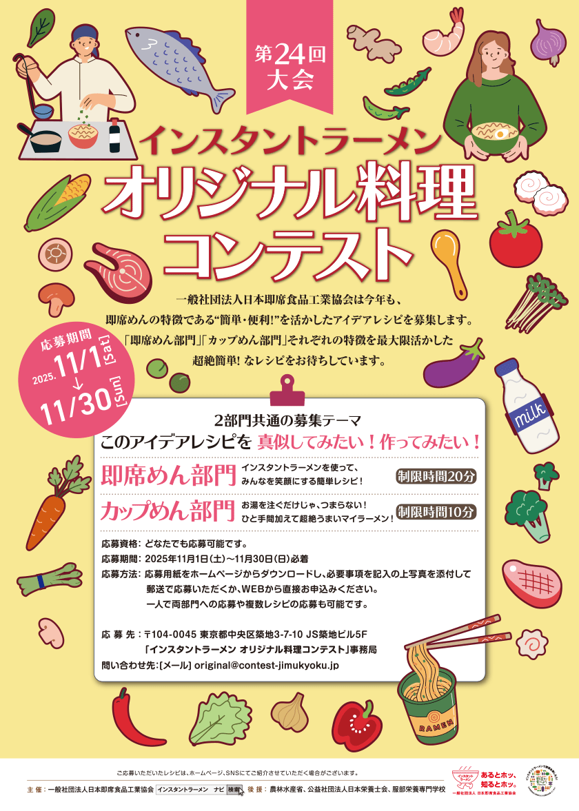 一般社団法人日本即席食品工業協会は今年も、即席めんの特徴である“簡単・便利!”を活かしたアイデアレシピを募集します。 「即席めん部門」「カップめん部門」それぞれの特徴を最大限活かした超絶簡単!なレシビをお待ちしています。