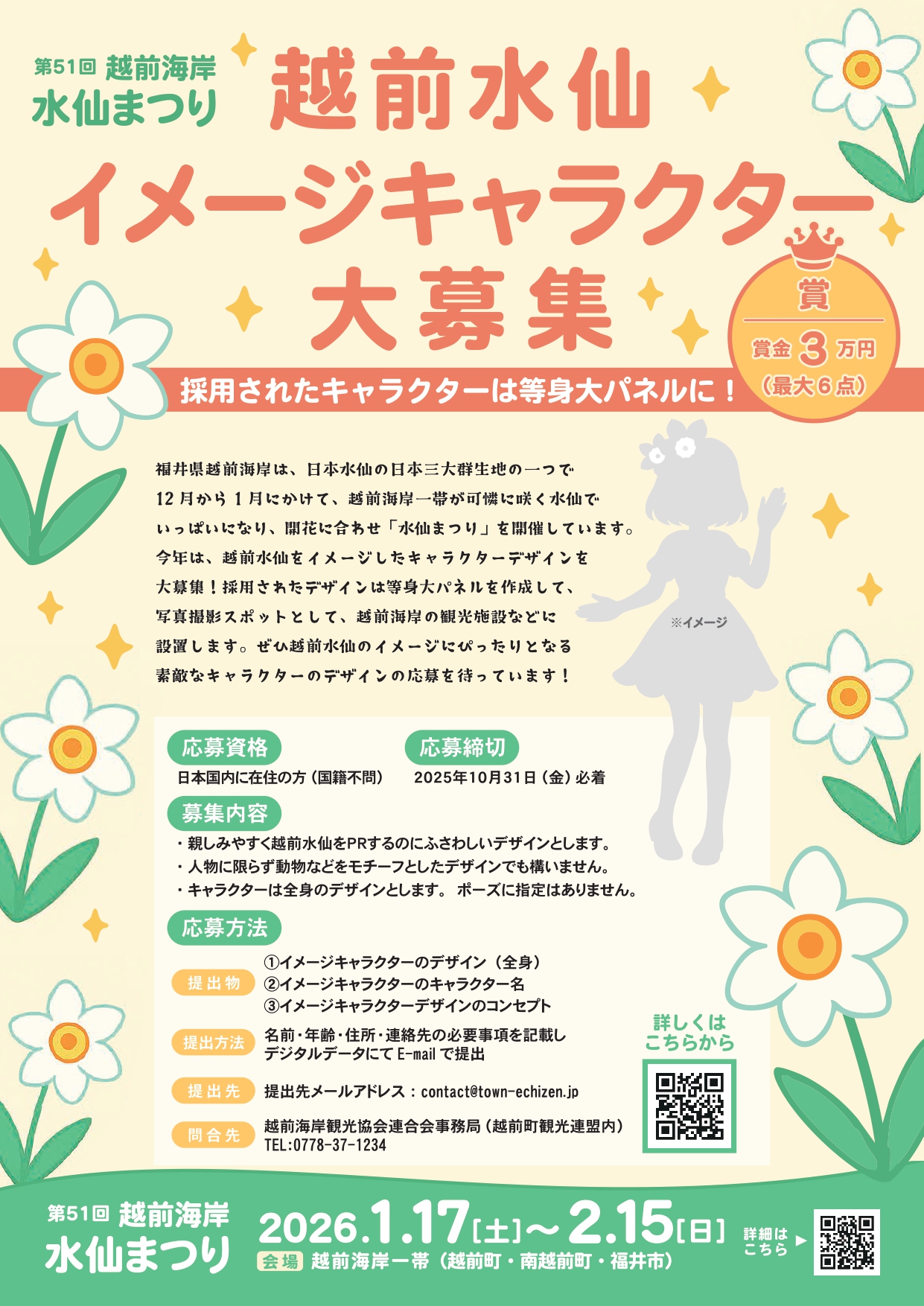 日本に水仙の三大群生地のひとつである福井県越前海岸。12月から1月にかけて見頃を迎え、それに合わせて「水仙まつり」を開催するそうです。今年はそのイメージキャラクターを広く募集しています。まつり期間には等身大パネルが用意され、撮影スポットとして活躍する予定だそうです。可憐な水仙のイメージにぴったりのキャラを考えましょう。人でも動物でもOKとのこと。採用者には3万円!