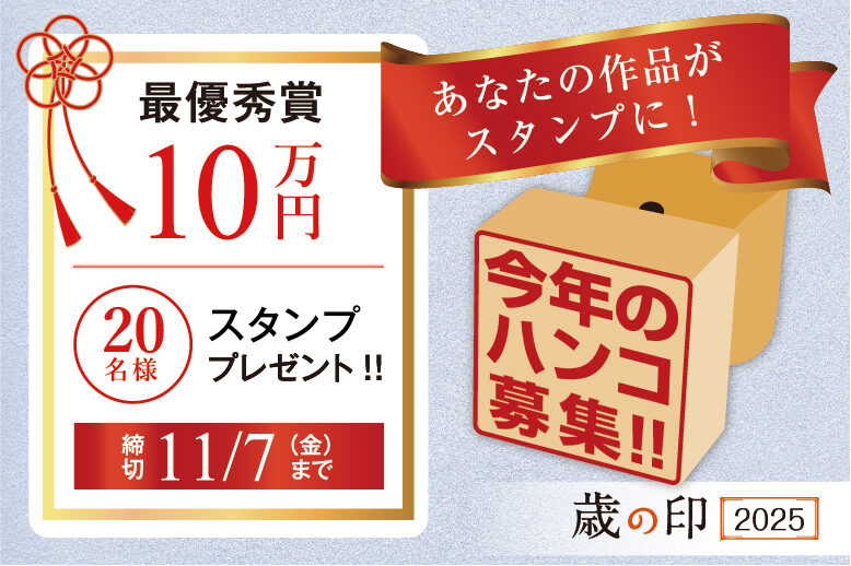なんと年末が近づいてきました。「今年を一言で表すと? 一文字で表すと?」という話題がではじめる時期ですが、今年を表すハンコを作ってみませんか? 2025年の「歳の印」の原画を募集する公募がこちら。受賞作に選ばれるとプロのハンコ職人が彫ってくれるので、かなり細かい絵柄でも大丈夫です。手描きでもOK、白黒での応募なので、パソコンが苦手な人やペン画が好きな人にもおすすめ!