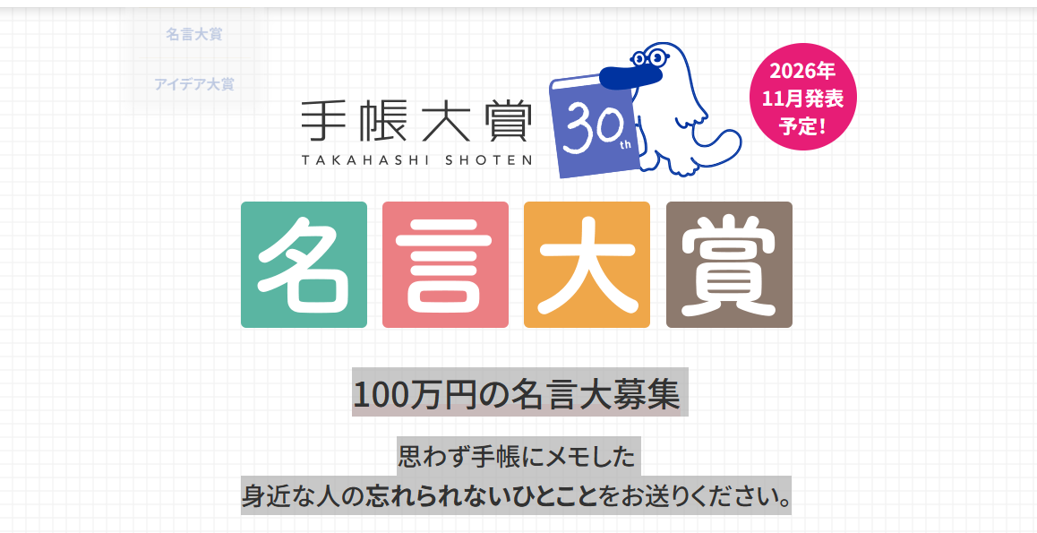 手帳シェアNO.1の高橋書店が今年も手帳大賞を実施。ふとした会話の中で、思わず手帳にメモしたくなった言葉があったら【名言大賞】部門へご応募を。大賞は100万円! サイトの応募フォームから、今すぐに応募できます。また、もうひとつの【アイデア大賞】部門では、あなた考案の手帳が実際に商品化。2年前に13歳の中学生が考案した「ポジティブ未来日記」は現在全国で販売中! 応募期間は4月末までとたっぷりあるので、思考を巡らせてみて。