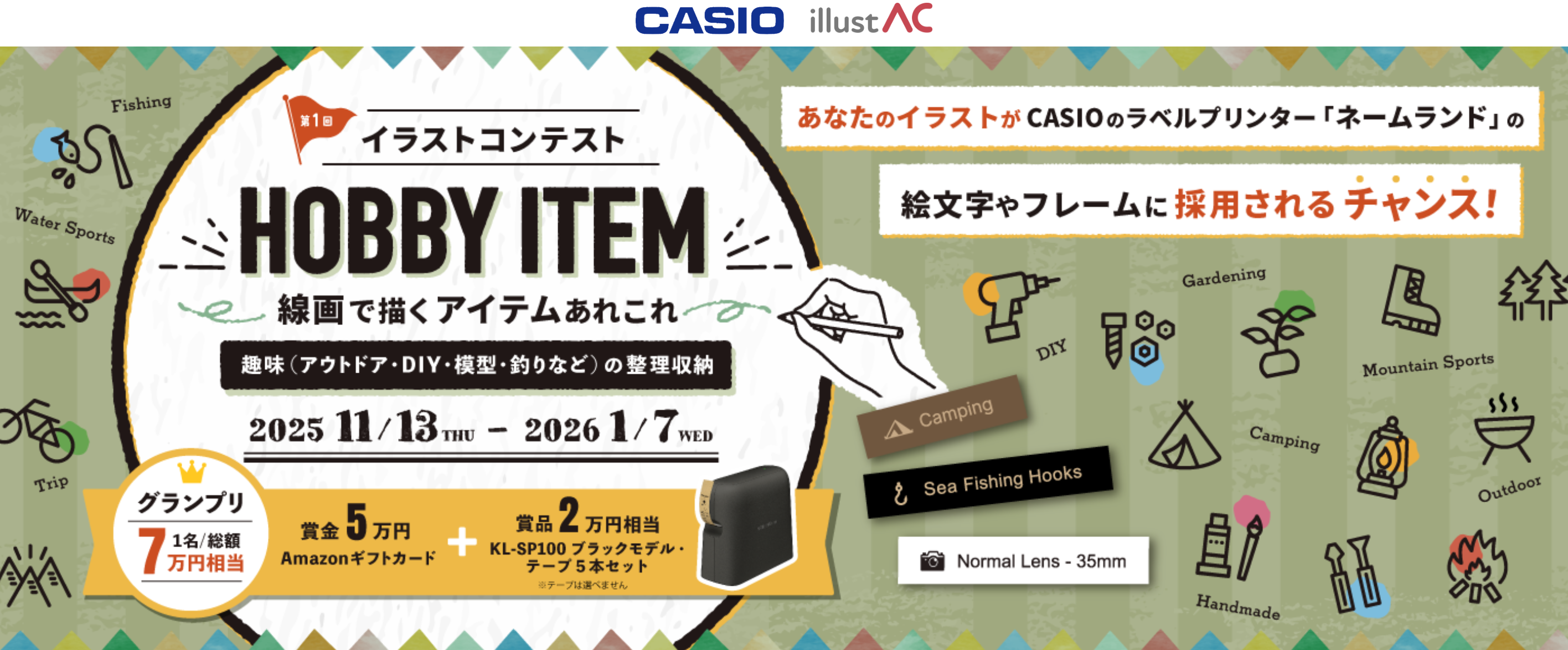 CASIOの「ネームランド」はスマホやパソコンの専用アプリで文字や絵文字を入力するだけで簡単にオリジナルラベルを作成できるラベルプリンター。第1回の今回は「HOBBY ITEM」がテーマの線画イラストを募集中です。受賞した作品は、CASIOの「ネームランド」のダウンロードコンテンツに採用されるチャンスあり! グランプリにはAmazonギフトカード5万円分とCASIOネームランドとテープ5本セットが!