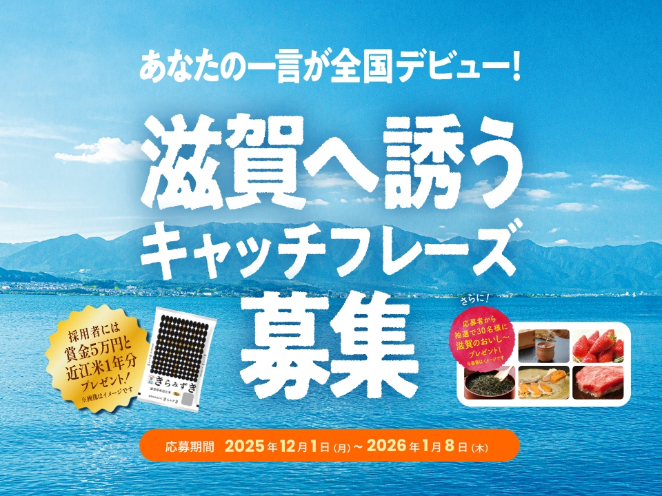 2027年に、滋賀は27年ぶりとなる大型観光キャンペーンを実施。それに先がけて、みんなが滋賀に来たくなるワクワク・ドキドキするキャッチフレーズを募集中! あなたが思う滋賀の魅力を15文字を目安に表現してください。最優秀賞には賞品として賞金5万円と近江米1年分! さらに応募者の中から抽選で30名に滋賀の味覚が当たります。