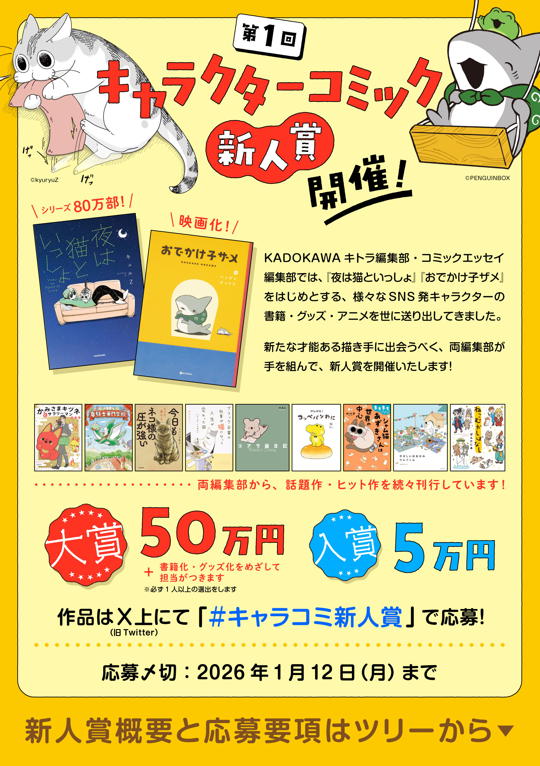 『おでかけ子ザメ』『夜は猫といっしょ』などを手掛けるKADOKAWAの『キトラ編集部』およびコミックエッセイ編集部が主催するマンガの新人賞です。可愛くて魅力的なマスコットキャラクターが登場する作品であれば、テーマは自由。大賞に輝いた方には賞金50万円が贈られるほか、書籍化・グッズ化を目指して担当編集がつきますので、キャラクターコミックに興味がある方はぜひ挑戦を。