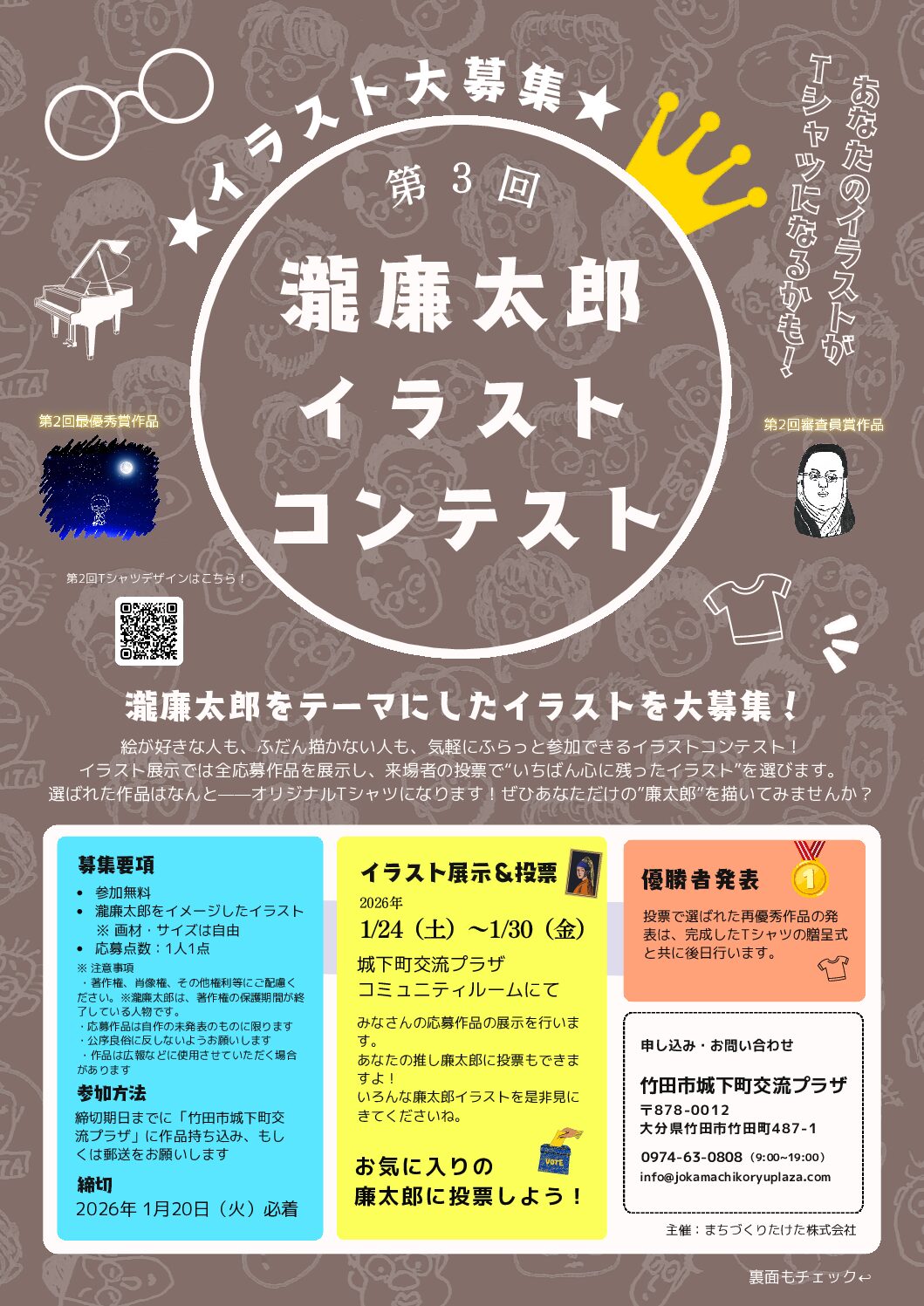 「荒城の月」や「鳩ぽっぽ」など、数多くの名曲を遺した瀧廉太郎をイメージしたイラストを募集しているコンテストです。本賞では全応募作品が大分県にある「竹田市城下町交流プラザ」に展示され、来場者の投票でいちばん心に残ったイラストが選出されますよ。 優勝者の作品は、オリジナルTシャツになるそう。応募は1人1点なので、とっておきの“廉太郎”で挑戦してみてくださいね。