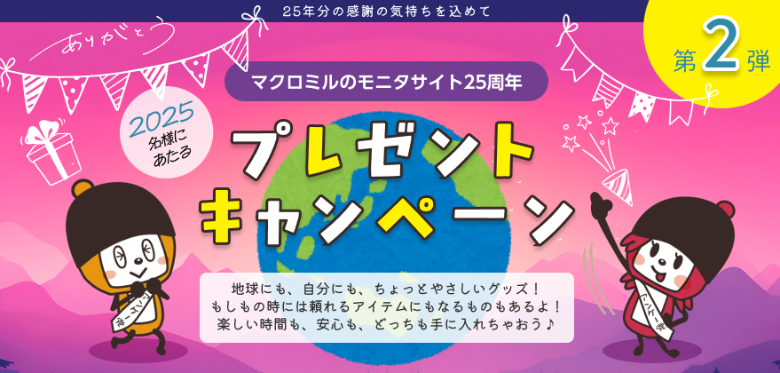 アンケートモニターで有名なマクロミルのモニタサイトが25周年を迎えました。これを記念して、豪華なプレゼントキャンペーンを実施! マクロミルにモニター登録をしている人ならだれでも応募できるので、参加しておいて損はないはず。もらえるのは、地球にも自分にもやさしいアイテムです♪