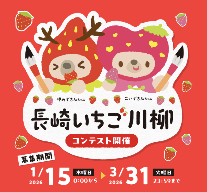 おいしいものがたくさん集まる長崎県では、いちごも人気特産品の1つ。そんな長崎いちごをテーマに川柳を作ってみませんか? 長崎いちご食べくらべセットをはじめとした豪華賞品を手に入れて、絶品いちごに舌鼓を打ってみましょう♪ 一般の部だけでなく中学生以下の部も設置されているので、家族みんなで応募してみてもいいですね。