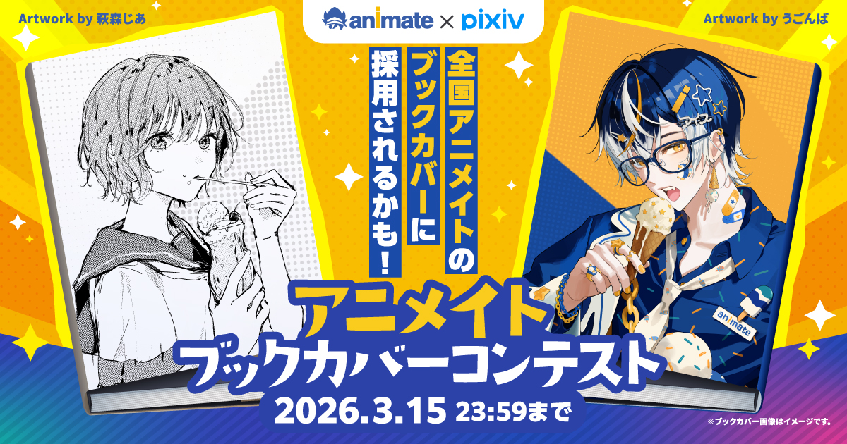 キャラクター系のイラストで力試ししたいアナタには、全国のアニメイトで配布予定のブックカバーのデザインを募集するこのコンテストがおすすめ! モノクロ部門では「クリームソーダ」をテーマにしたイラスト(A6サイズ)、フルカラー部門では「アイス」がテーマのイラスト(B6サイズ)を募集しますよ。