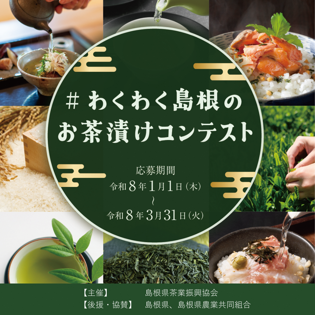 小泉八雲と妻をモデルにしたNHKドラマ「ばけばけ」。もうすぐ島根編が終わりそうですね。「ばけばけ」効果で熱い注目を集めている島根県は、お茶とお米も有名です。そこで、島根県産のお茶とお米を使用したお茶漬けレシピを募集! Instagramから気軽に応募できます。映えにも味にも、島根県の魅力にもこだわりましょう。最優秀賞には、1万円相当の島根産お茶セットと、米10kgが贈られます。