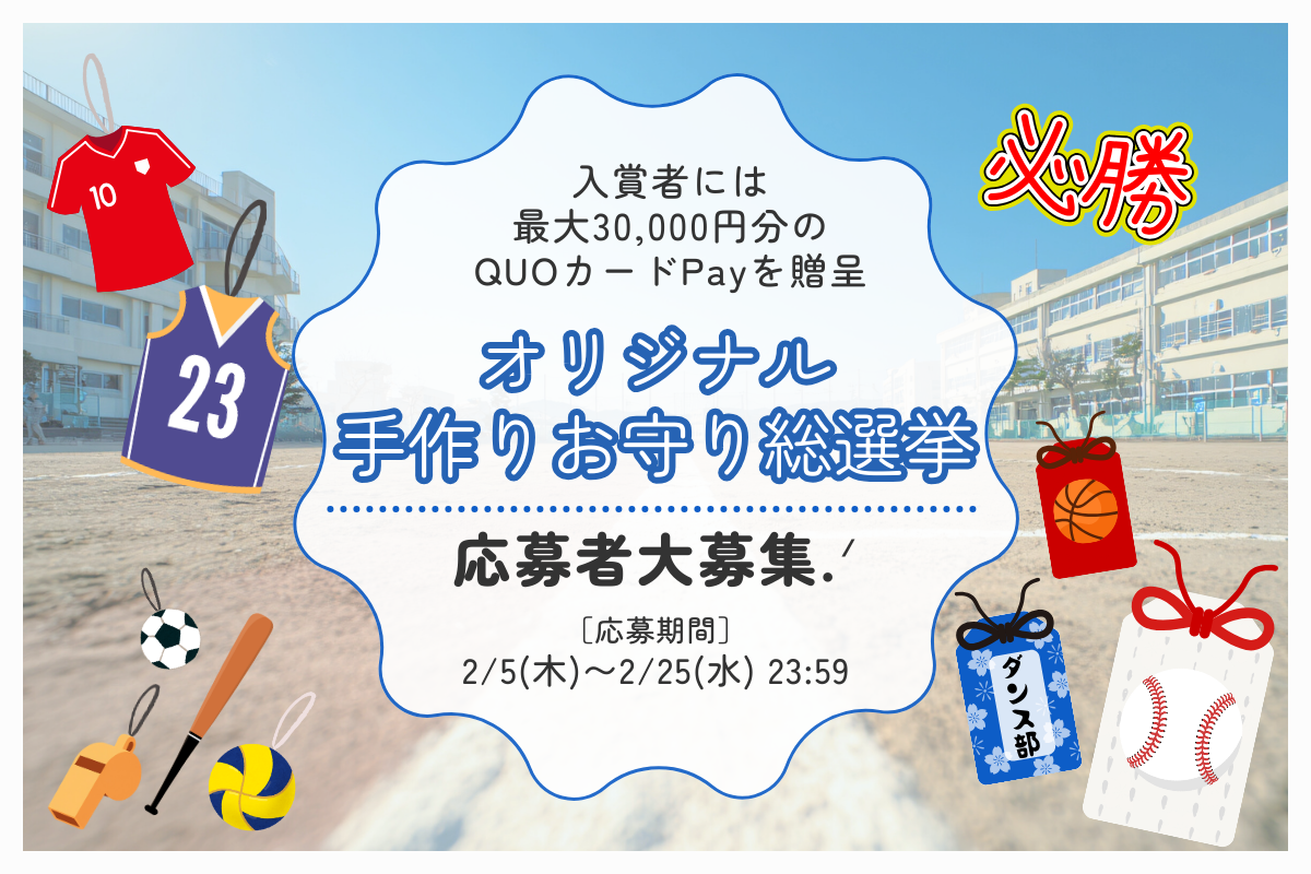 合格祈願や、発表会の成功、試合に勝つように、病気や怪我が治るように……など、願いを込めて誰かにお守りを作ったことがある人はいませんか? 高校生限定のこの公募は、手作りお守りを募集するユニークな企画。ユーザー投票によって選ばれた上位3点にQUOカード(1位は3万円分)が贈られます。画像で応募できるので、過去に作ったものでも画像があれば応募できます。