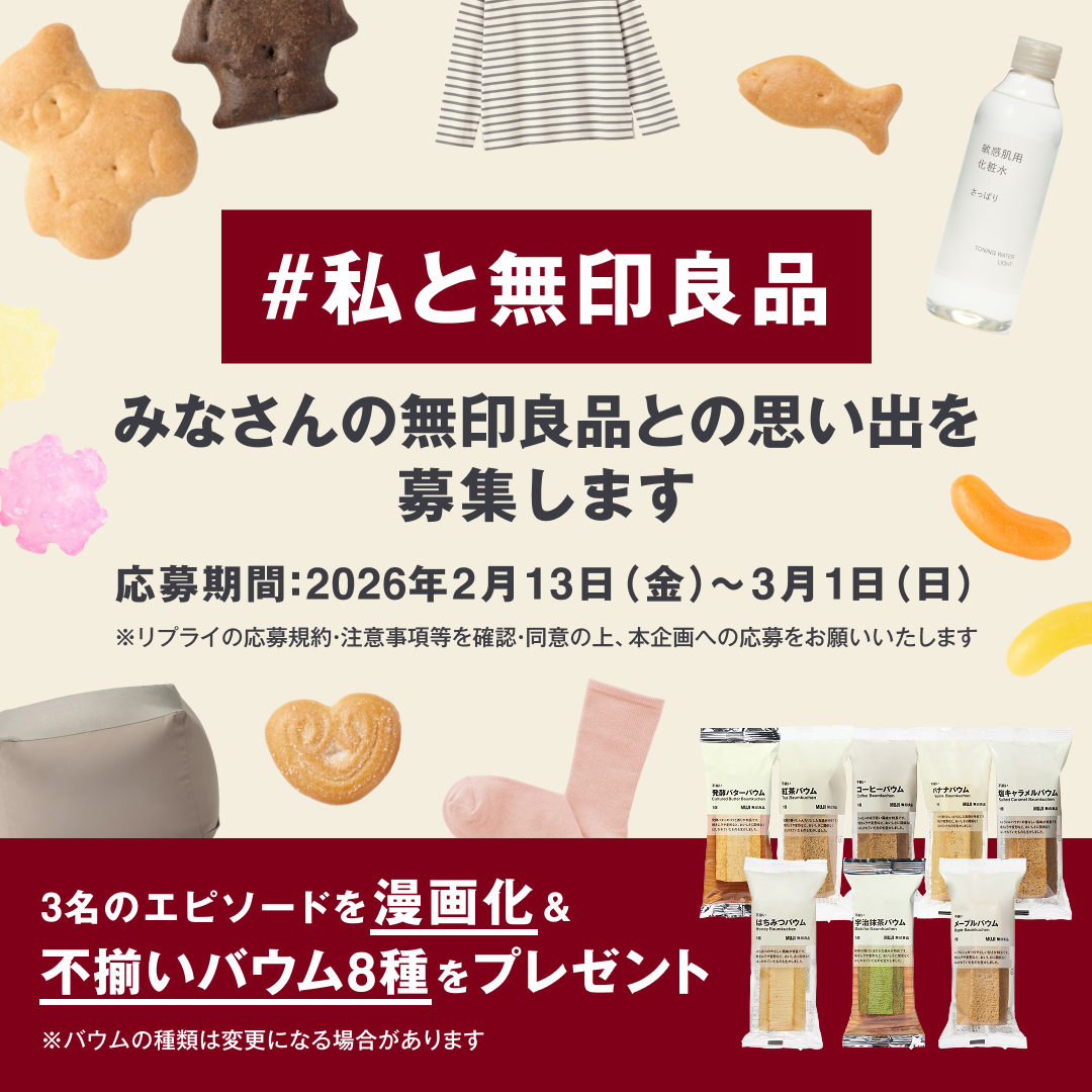 無印良品、使っていますか? 日用品や雑貨、衣服、そしてお菓子やレトルトまで、使って食べて心地よいものが揃っていますよね。そんな無印良品との思い出を募集! X(旧Twitter)から隙間時間に気軽に応募できます。応募作品から3点が漫画化されるとのこと。また、採用者には人気商品・不揃いバウム8種がプレゼントされます!