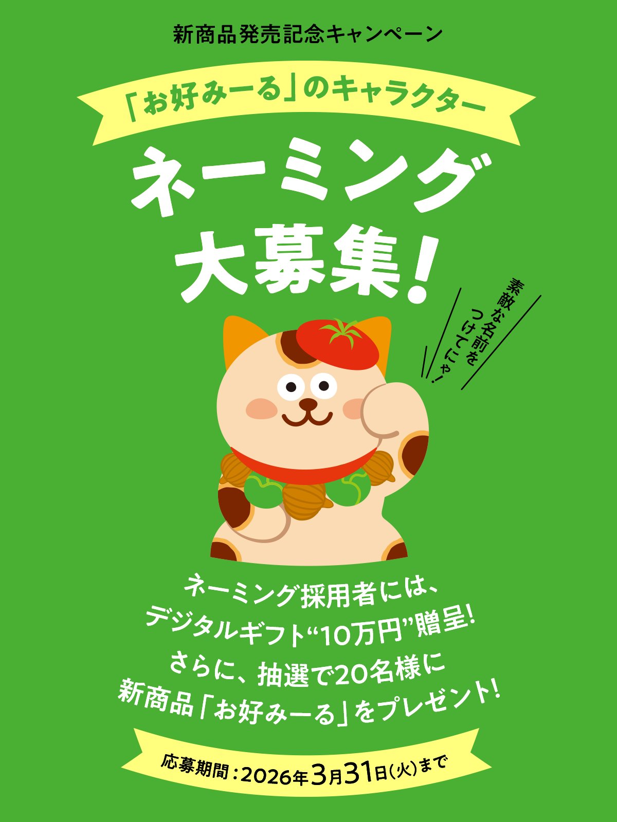 小麦粉やホットケーキミックスで有名な『昭和産業株式会社』は、2026年3月より、レンジで調理できる粉もの料理用ミックス『お好みーる』の発売を開始しました。それを記念して、同商品のキャラクターの名前を大募集! キャラクター誕生の背景とプロフィールが公開されているので、そちらを踏まえて魅力的な名前をつけてあげてください。見事、名前が採用された方にはデジタルギフト10万円が贈られるほか、応募者から20名の方に『お好みーる』が抽選で当たります。