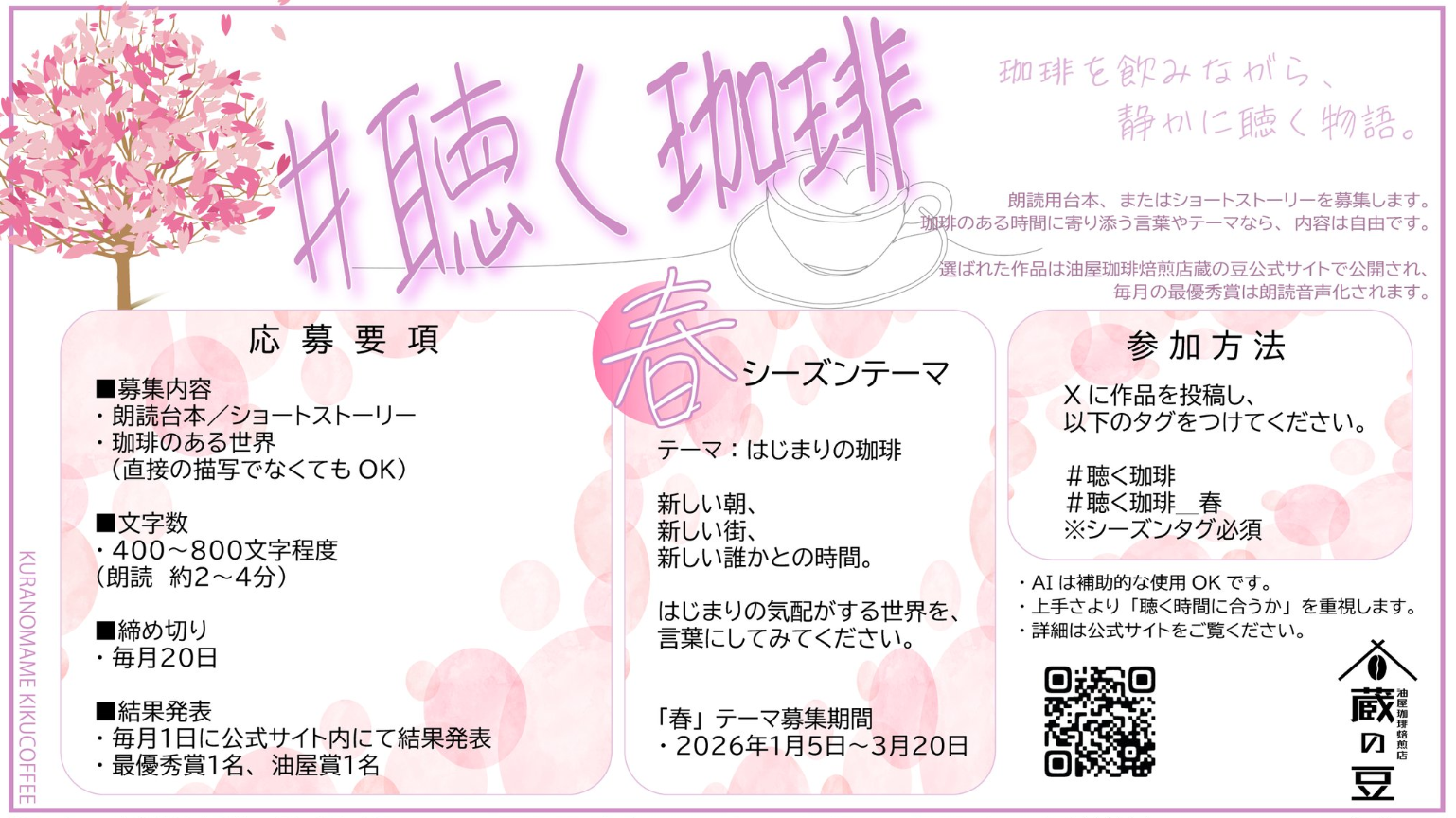 珈琲を飲みながら聴くための、優しく寄り添う物語を募集しています。技巧や派手な展開よりも、声にした時の心地よさや余白を大切にする企画です。春のテーマは「はじまりの珈琲」。新生活の少し落ち着かない朝や出会いの気配をあなたの言葉にしてみませんか。完成度や経験よりも、「聴く時間に合うか」が重要視されるため初心者も大歓迎。最優秀作品はプロの手で朗読・音声化されます。