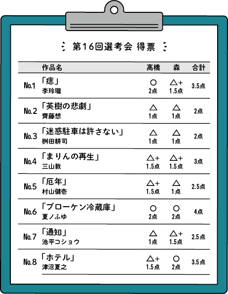 高橋「ブローケン冷蔵庫」が頭一つ抜けていたと思います。日常生活の悲劇ですよね。日常生活は3㎝の違いで入れなくなったりする。この小ささがいい。小さいものが悲劇になるという着眼点がよかったです。