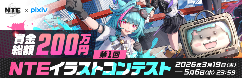 2026年4月29日リリースのオープンワールドRPG「NTE」×pixiv主催のイラストコンテスト。ゲーム世界を自由に描く「ファンアート部門」と、キャラクターに着せたい新衣装をデザインする「鑑定士衣装部門」の2部門で募集中。さらに応募作品をX(旧Twitter)でシェアするキャンペーンでも賞金を狙えちゃう。あなたの絵で新たなゲーム世界を盛り上げていこう。