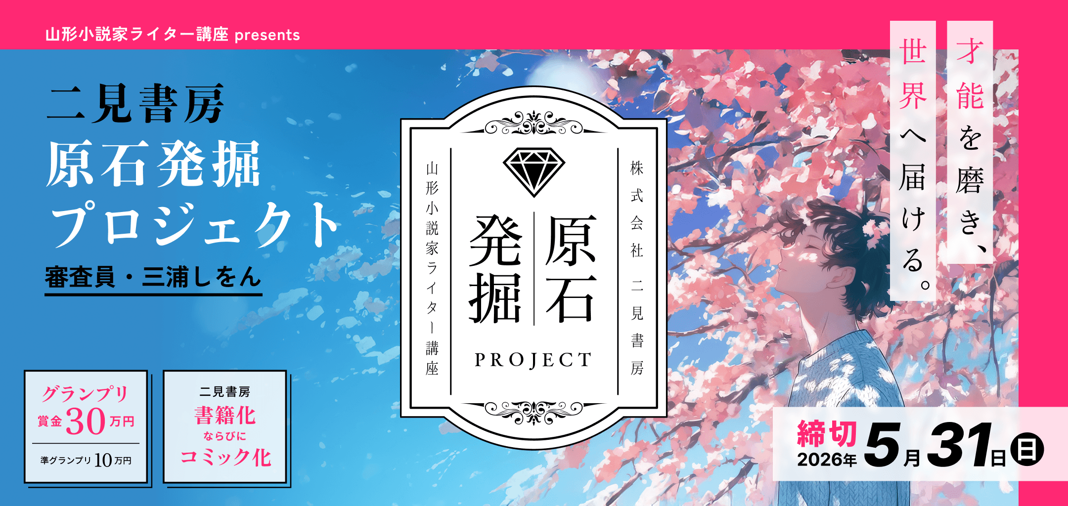 従来の枠や文脈にとらわれないBL(ボーイズラブ)小説を募集。そう、BL作品ももはや定番ジャンルの一つ。だからこそ、新たな原石の発掘が求められるのです! 今回は400字詰め原稿用紙換算150枚~200枚の作品が対象。一次選考通過者は全2〜3回の特別講座を受講し、その上で受賞作が決まります。グランプリには賞金30万円に加え、書籍化、コミック化も確約されます。