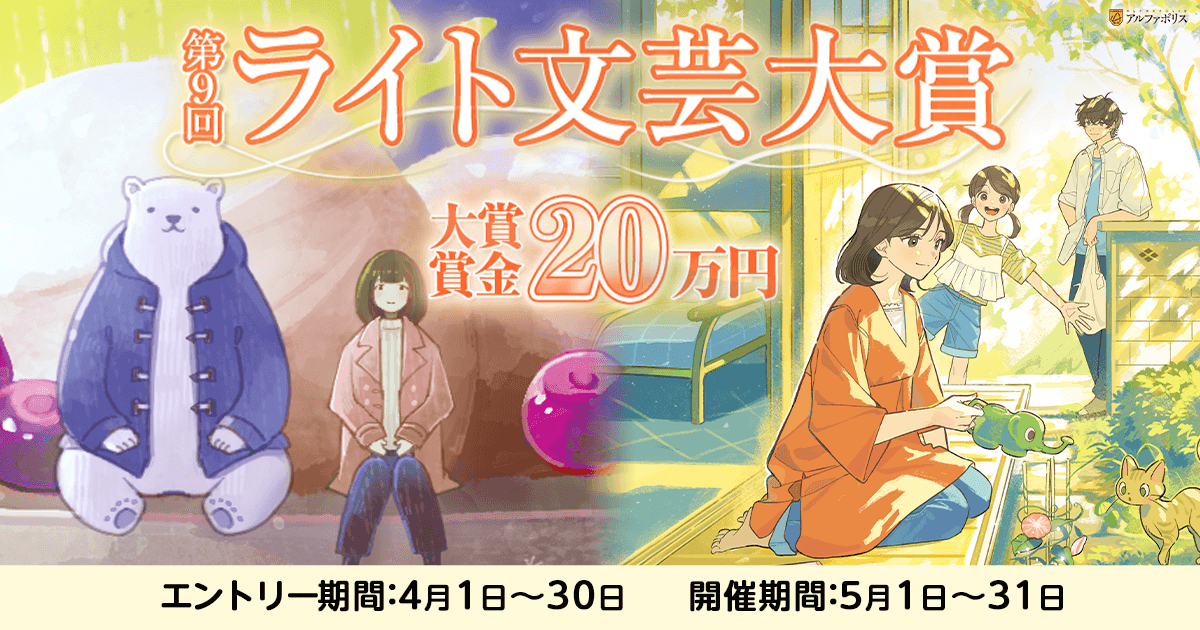 一般の文芸のように主題をしっかり書きつつ、文体は比較的ライトな小説ジャンルを「ライト文芸」と名付け、幅広い作品を募集する文芸賞です。「命の輝き」「切ない別れ」「青春」「家族愛」「何気ない暮らしの景色」「料理・グルメ」というテーマから選んでも、それ以外でも応募OK。小説を投稿できるWEBサイト・アルファポリス電網浮遊都市から応募しましょう。大賞には20万円が進呈されるほか、書籍化の可能性も。