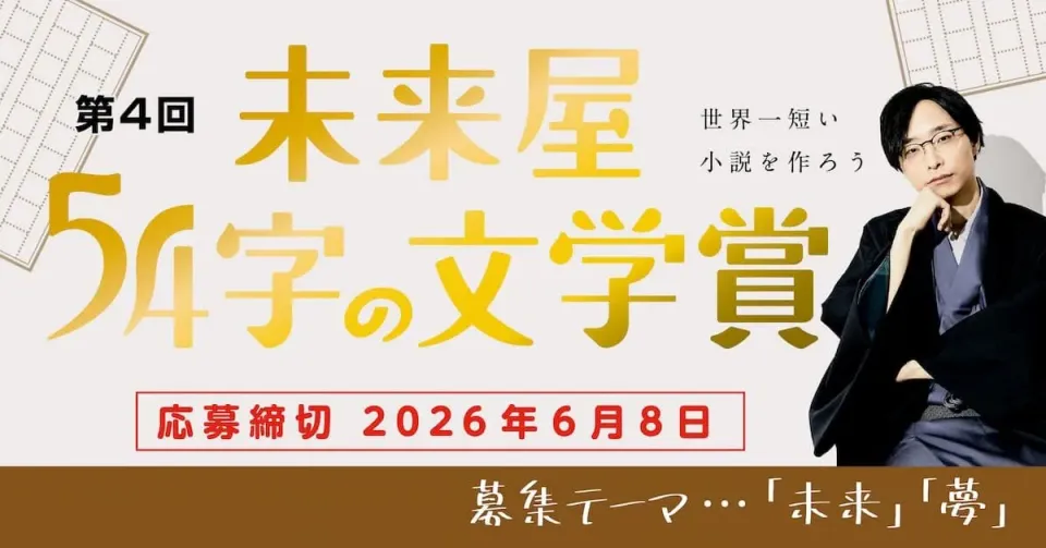 9字×6行の54字の原稿用紙のマス目に、小さな物語を書いてみませんか? 書籍でも人気の「54字の物語」シリーズ最新作刊行を記念して開催される、小説としてはおそらく最短の文学賞がこちら。「未来」か「夢」をテーマにした作品を募集しています。応募ハガキをダウンロードするか、X(旧Twitter)から投稿しましょう。最優秀賞には受賞作を刻んだトロフィーと図書カード2000円分を進呈!