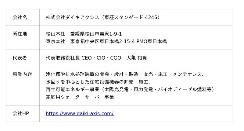 - 2025年8月7日 「ダイキアクシス、愛媛・宇和島市より感謝状受贈 ~ 企業版ふるさと納税と浄化槽学習イベントで地域貢献を実現 ~」