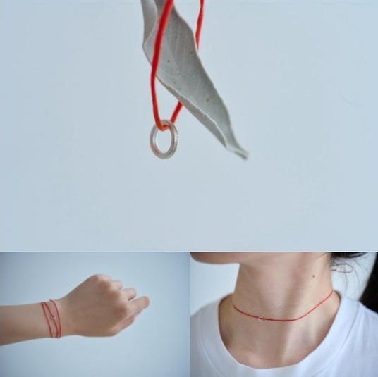 細く繊細な赤のワックスコードに、小さなシルバーのチャームをひとつ。コードの長さは約32cm。首元にフィットするチョーカーとしてはもちろん、手首や足首にくるくると巻いても使えます。