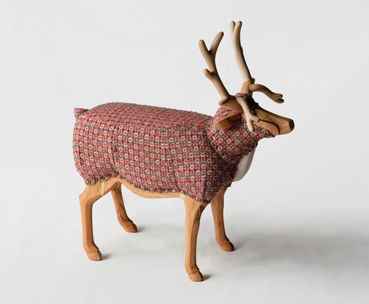 北奥 美帆 「トナカイ no.10」木材(サクラ、カエデ)・インテリアファブリック・ウレタンフォーム・綿・鋲・家具用オイル塗料、h73×w75×d30cm、2024年