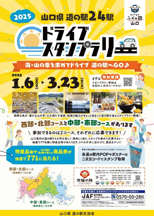 JAF(一般社団法人 日本自動車連盟)山口支部(支部長 大原敏之)は、1月6日(月)から開催されている「2025 山口県 道の駅24駅ドライブスタンプラリー」(主催:山口県 道の駅交流会)の実施に協力しています。