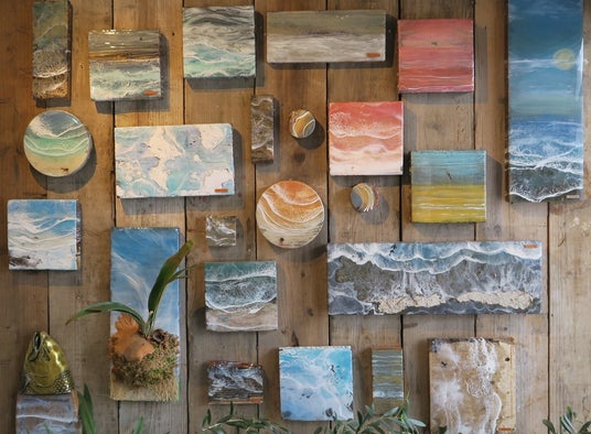 仕事・子育てに一区切りがつき、2023年より本格的にアート活動をはじめる。役目を終え廃棄処分となる足場板をキャンバスに、エポキシ樹脂の特性を活かした作品を手掛ける。主に、海や波、山、雲などの自然物の情景を表現し、光の加減でさまざまな表情を楽しむことができる。液体のコントロールや硬化時間の間にまるで生き物を育てるかのような作品作りに励む。