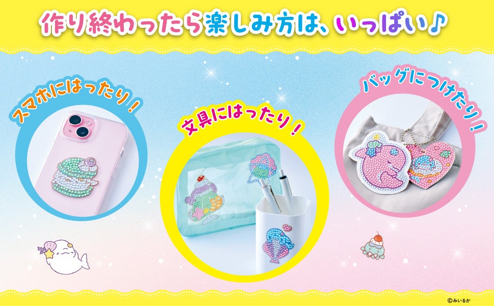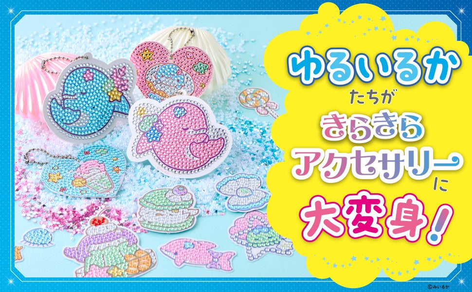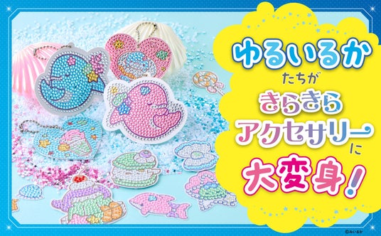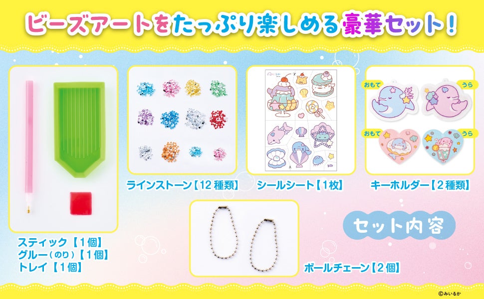 「あおいるか」と「ぴんくいるか」を持ち歩ける、キラキラ可愛いキーホルダーが2種類。さらに、「しろいるか」や「くーみん」たちのデコれるシールが、なんと15種類も作れる盛りだくさんのビーズアートキットです。