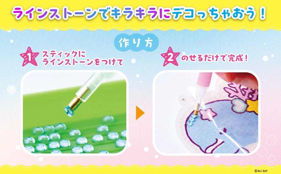 キーホルダーやシールに描かれた記号にラインストーンをのせていくだけで、キラキラ光る可愛いシール&アクセサリーがあっというまに完成します。