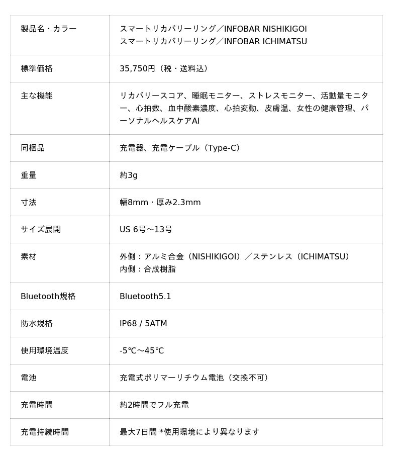つけるだけで「睡眠」「ストレス」「活動量」を計測し、専用アプリで詳細なデータを確認できる指輪型ウェアラブルデバイス「スマートリカバリーリング」に、auのデザインケータイ「INFOBAR」とのコラボデザインが登場しました。