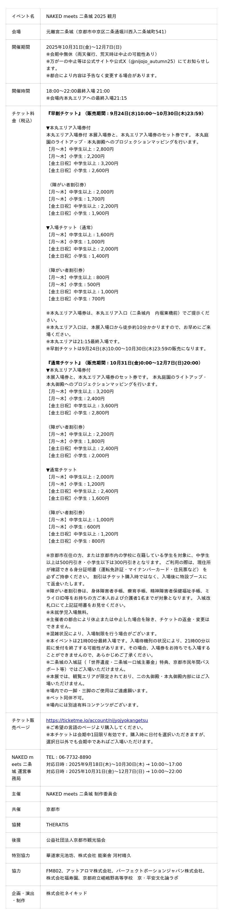 株式会社チケミー(本社:東京都港区、代表取締役:宮下大佑)は、株式会社ネイキッドが企画・演出を手がける秋の体感型アート展『NAKED meets 二条城 2025 観月』の早割チケットを、NFTチケットサービス「チケミー(TicketMe)」にて販売開始いたしました。