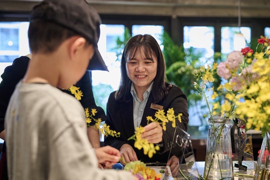 過去のワークショップでは、母の日をテーマにアレンジ体験を行いました。吟味した色とりどりの花を特別仕様のバッグに入れ、ラッピング。バッグにメッセージを書いたら、世界で一つだけのギフトの完成です。花の形を眺めたり匂いをかいだりして、楽し気に過ごす子どもたちの笑顔に包まれた一日となりました。