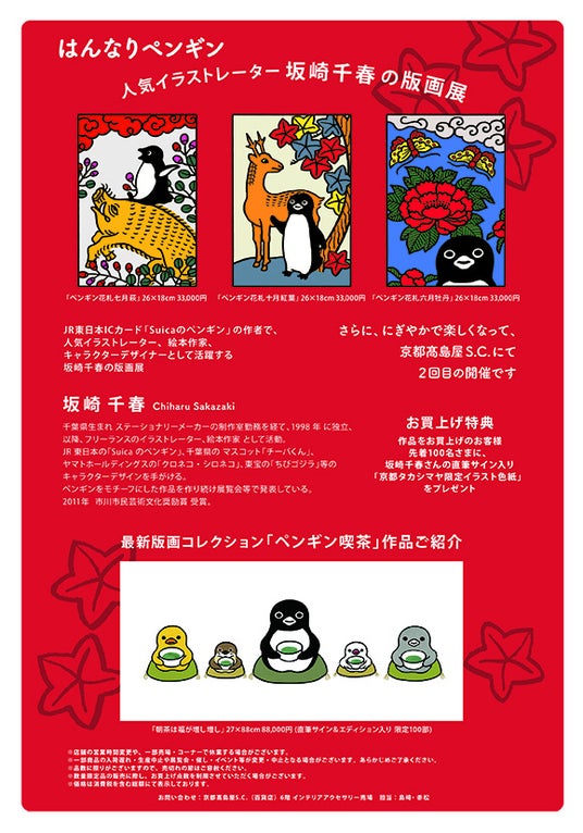 【開催中~11/16日(日)まで】Suicaのペンギンの作者 坂崎千春の版画展〈はんなりペンギン〉が京都高島屋で開催中。人気のペンギン花札の新作版画や、一点もの九谷焼コラボ作品も登場!