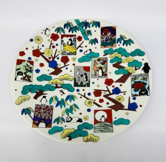 一点もの九谷焼コラボ作品 大皿「ペンギン花札に松竹梅」