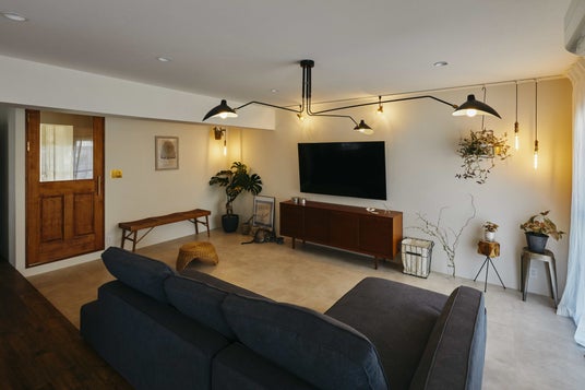 塗り仕上げをしたLDKは、落ち着きのある自然な風合いが印象的です。シンプルな色味の仕上げだからこそ、施主様がこだわって集めた照明や家具が引き立ちます。