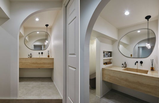 アーチ開口のサニタリースペースは、手前に洗面室、奥には扉がないトイレという開放的な間取り設計。廊下から見えない工夫が施されており、日本にいながら海外のホテルで暮らしているような気分を味わえます。