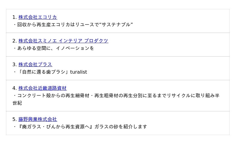 世界が注目するカーボンニュートラル技術と、限りある資源を再生・活用して生まれたリサイクル製品を製造する計21社が自社の技術や製品を展示します。