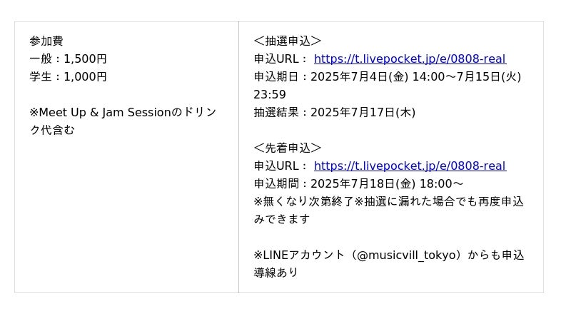 イベントの申込みと楽曲エントリーは本日よりスタートします。イベント参加は、今回からチケットサイトのLivePocketとMusicians' Village TOKYOのLINEアカウント(@musicvill_tokyo)にて受け付けます。
