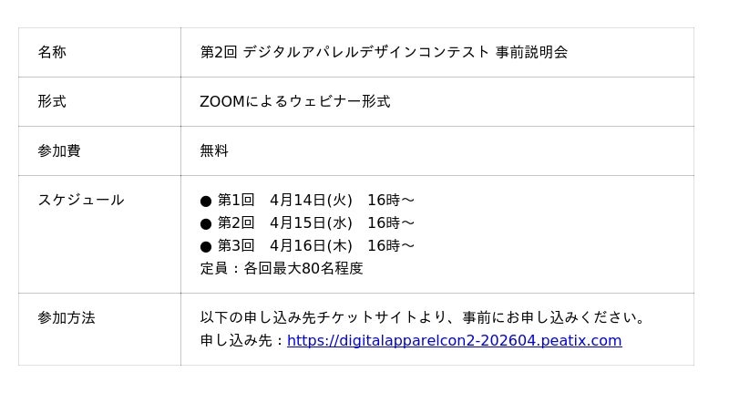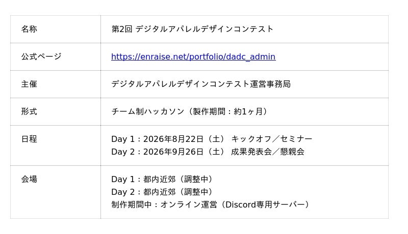 2026年4月頃:ハッカソンルール発表および参加者募集開始(別途告知)◆デジタルアパレルデザインコンテスト運営事務局