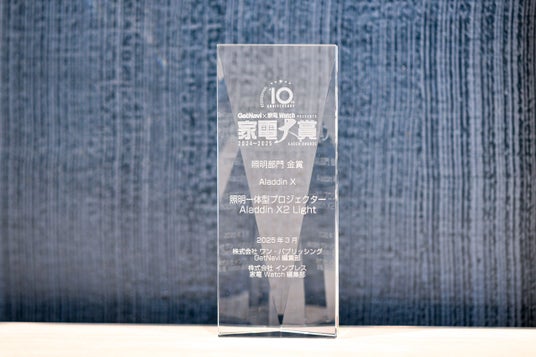 「家電大賞」のノミネート製品は、アイテム情報誌「GetNavi」編集部と家電専門ニュースサイト「家電 Watch」編集部が協議のうえ選定をし、10回目となる今年は、22部門で計200製品がノミネート。読者の投票により、2024年ナンバーワンの家電製品が決定しました。多くの優れた家電製品がエントリーする中、「Aladdin X2 Light」は、照明部門において金賞を受賞しました。