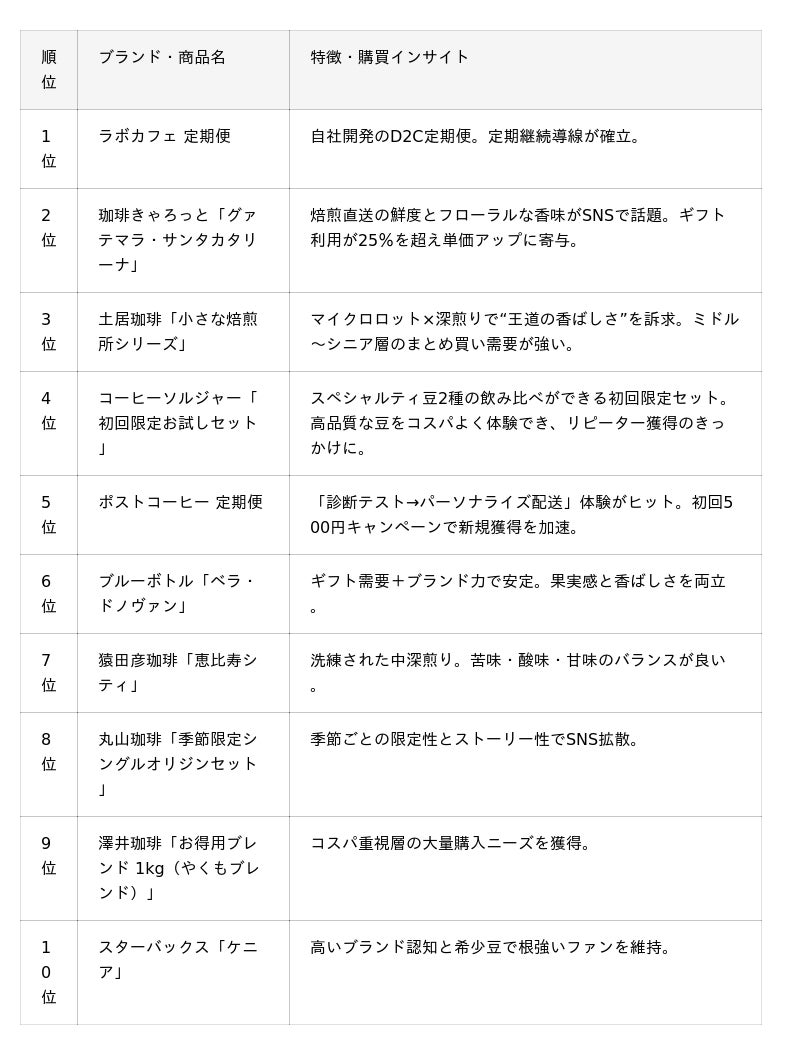 - 土居珈琲『グアテマラ カペティロ農園(小さな焙煎おためしセット)』:少量焙煎で鮮度と甘み・コクを両立。中高年層を中心に支持。