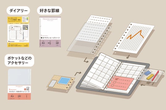 ルーズリーフなので、中身を自由に組み合わせ、あとから整理もできる。また、必要な分だけをスリムに持ち運びが出来る。