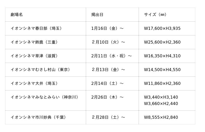 今回の「マーベル・スタジオ オリジナルアート シーニック」は、イオンシネマ春日部(埼玉)、イオンシネマ鈴鹿(三重)、イオンシネマ草津(滋賀)、イオンシネマむさし村山(東京)、イオンシネマ大井(埼玉)、イオンシネマみなとみらい(神奈川)、イオンシネマ市川妙典(千葉)の計7劇場で順次掲出予定。中でもイオンシネマ鈴鹿では、圧巻の幅25メートルを超える巨大壁画が登場します。初お披露目は、「ヒーローの日」として知られる1月16日(金)、イオンシネマ春日部からスタートいたします。