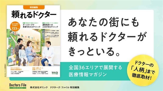 ドクターの考えや治療方針など知りたい情報をわかりやすく発信する、地域密着型の医療情報マガジンです。「あなたの住む地域に頼れるドクターがいる」。そんな安心感を届けたいという想いから、当社は各エリアのドクターたちの“医療への熱い想い”を徹底取材してきました。地域医療情報サイト「ドクターズ・ファイル」が特別編集した医療情報誌として、エリアごとに年1回発行しています。2008年の創刊以来、好評をいただき、徐々にエリアを拡大。昨年は関東地方・東海地方・関西地方・山陰地方・四国地方・九州地方の全29版を発行し、書店・コンビニ・amazon・楽天ブックスで、販売しています。