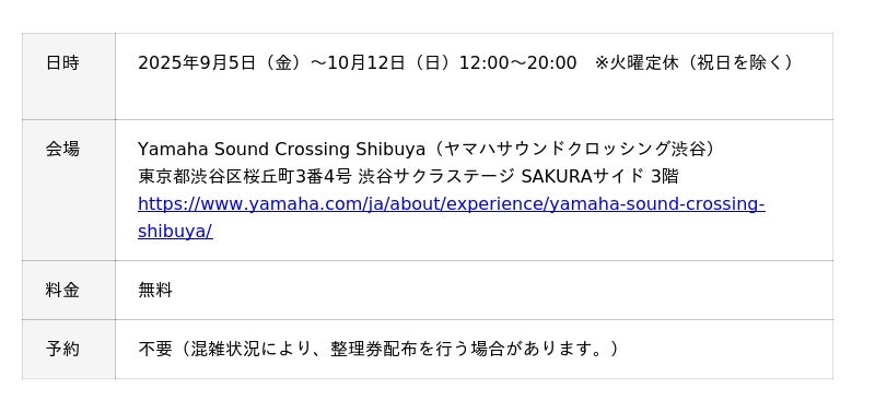 期間:2025年9月5日(金)~10月12日(日)、会場:Yamaha Sound Crossing Shibuya(ヤマハサウンドクロッシング渋谷)