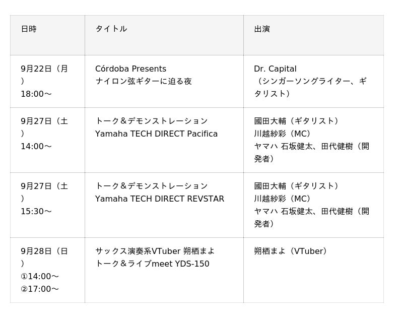 期間中、当社およびグループブランドの製品・技術に関するステージイベントを開催します(配信あり)。参加方法や配信などの詳細は、Yamaha Sound Crossing Shibuyaのウェブサイトに掲載予定です。