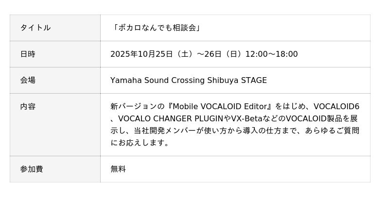 『Mobile VOCALOID Editor』新バージョンの発売を記念して、「ボカロなんでも相談会」イベントを10月25日(土)、26日(日)にYamaha Sound Crossing Shibuya で開催します。詳細は、Yamaha Sound Crossing Shibuya のウェブサイトをご確認ください。