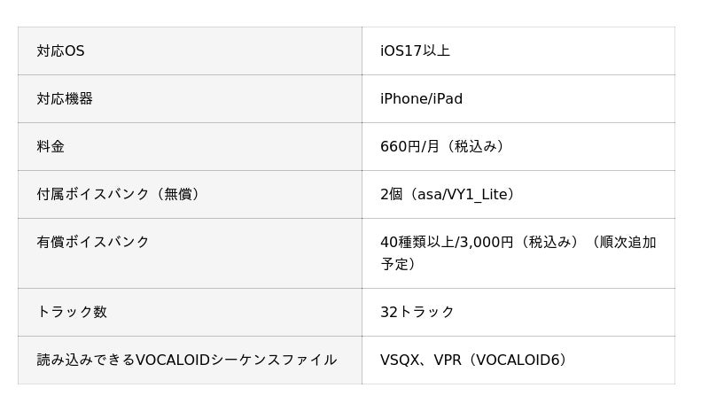 今回、より手軽にご利用いただけるサブスクリプション版の提供を開始するとともに、PC/Mac版VOCALOID6と同様にAI技術を活用した新合成エンジン「VOCALOID:AI」が搭載し、より自然で表現力豊かな歌声の合成を可能にしました。加えて、儚く透明感のある歌声が特長の新ボイスバンク「asa」を標準搭載。「初音ミク」、「IA」や「v flower」などの従来からのボイスバンク(※3)だけでなく、「AI Megpoid」、「AI 音街ウナ」などVOCALOID:AI対応のボイスバンクも利用可能となり、ボイスバンクの選択肢を広げました。