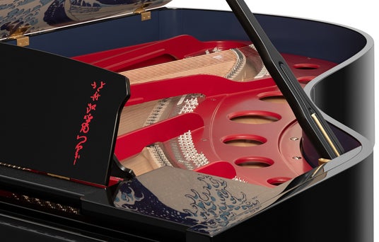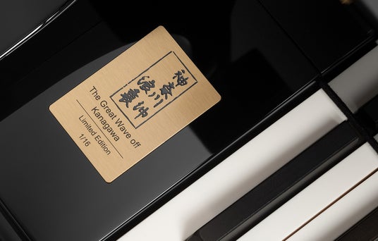 葛飾北斎の浮世絵揃物「富嶽三十六景」の中でも最高傑作と呼ばれる「神奈川沖浪裏」を特殊な印刷技術を用いてピアノの屋根の内側に描いています。作品の色彩テーマを継承し、ピアノの側板の内側と椅子のクッションにはプルシアンブルーをあしらっています。また、ピアノのフレームと譜面台に施された葛飾北斎の署名は赤色で、日本文化における赤色の持つ特別な意味が反映されています。赤は太陽を象徴すると同時に邪気を払う色とも考えられています。さらに鍵盤左側の拍子木部分には、シリアルナンバーが刻印された真鍮のプレートが埋め込まれ、限定モデルに相応しい特別感を演出します。
