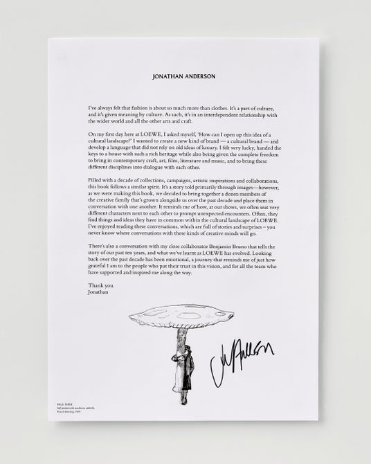 10年にわたるジョナサン・アンダーソンのコレクションとカルチャープロジェクトの数々をビジュアルとともに回顧する本書。デビューを飾った2015春夏ウィメンズショーから2025春夏メンズショーまで、ロエベのクリエイティブ ディレクター在職中のハイライトを紹介しています。636ページにおよぶ本書は、在任期間を概略的に振り返りながら、10年間の彼のアイコニックなデザイン、キャンペーン、キャットウォークのデザイン、店舗内装のフルブリード写真を、アートやクラフト作品、舞台裏とともに収めています。また、こうしたイメージ群のほかにも、ゼイディー・スミスによる序文、ジョナサン・アンダーソンとスタイリストのベンジャミン・ブルーノの長編対談、ロエベのフレンズやファミリーとのダイアローグ、コラボレーションをおこなったアーティストの特集が掲載されています。