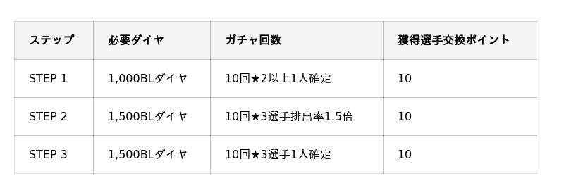 STEPを進めるごとに★3選手排出率が上昇し、今回はSTEP3で★3選手が1人確定となります。